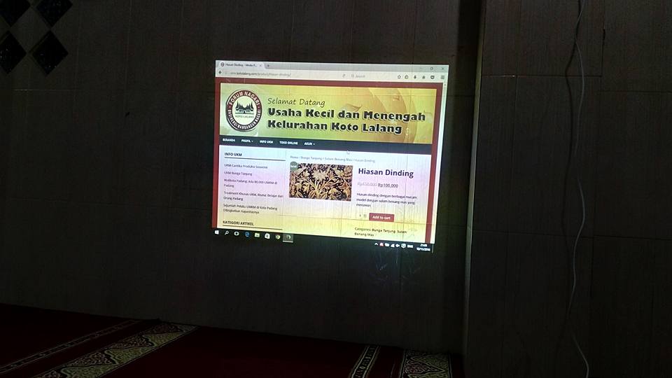 Setelah sholat magrib dan Isya, Jam 20:30 s.d 22:00 WIB, bertempat di Masjid Thariqatul Jannah Kel. Koto Lalang, dilaksanakan pelatihan dan sosialisasi bagaimana memasarkan produk dari UKM Sulam Benang Mas dan UKM Cantika yang bergerak dibidang souvenir dan bed cover/sprei. Kedua UKM ini dibantu melalui program pengabdian masyarakat kami selaku dosen dari Politeknik Negeri Padang, nantinya produk mereka akan di jual secara online di www.ukm.kotolalang.com