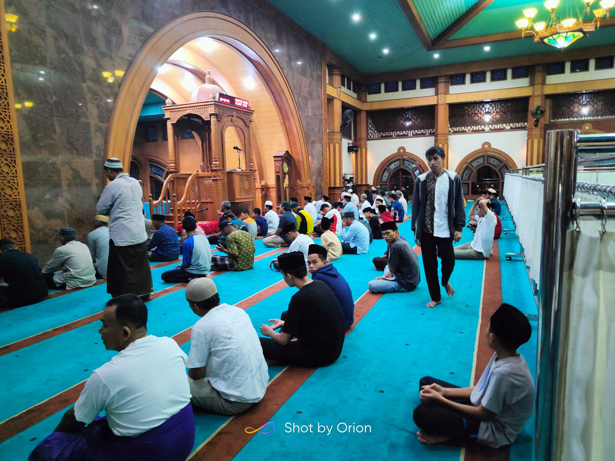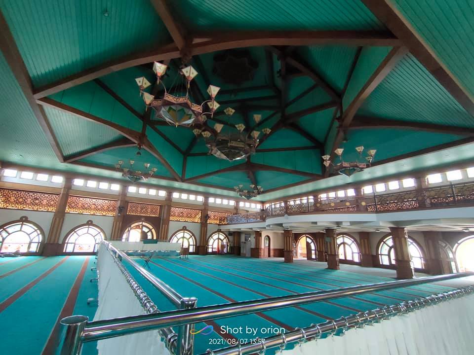 Dinding masjid dilapisi papan berukir yang disapu nuansa gelap. Tiang-tiang penyangga masjid yang terbuat dari tembok dihiasi warna lembut sehingga sangat serasi dengan dinding masjid.
