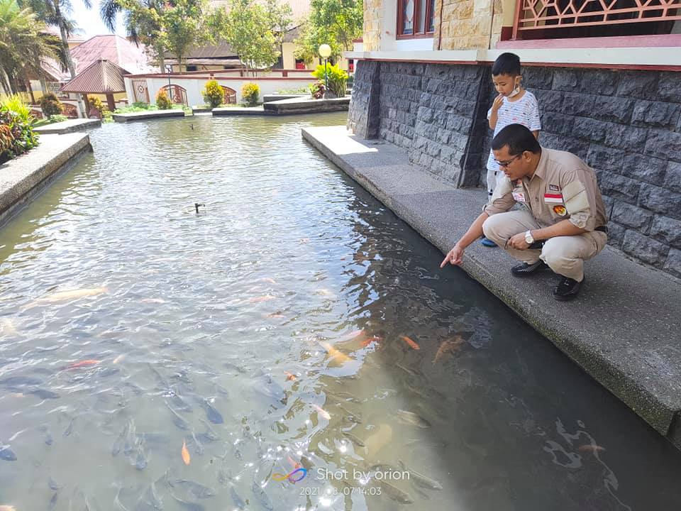 Ketika kaki melangkah memasuki area masjid, tampak air mancur terus memancar. Melangkah ke belakang masjid, terdapat kolam ikan yang tertata rapi. Di kiri-kanan kolam ikan tersebut terdapat tempat wudhu.