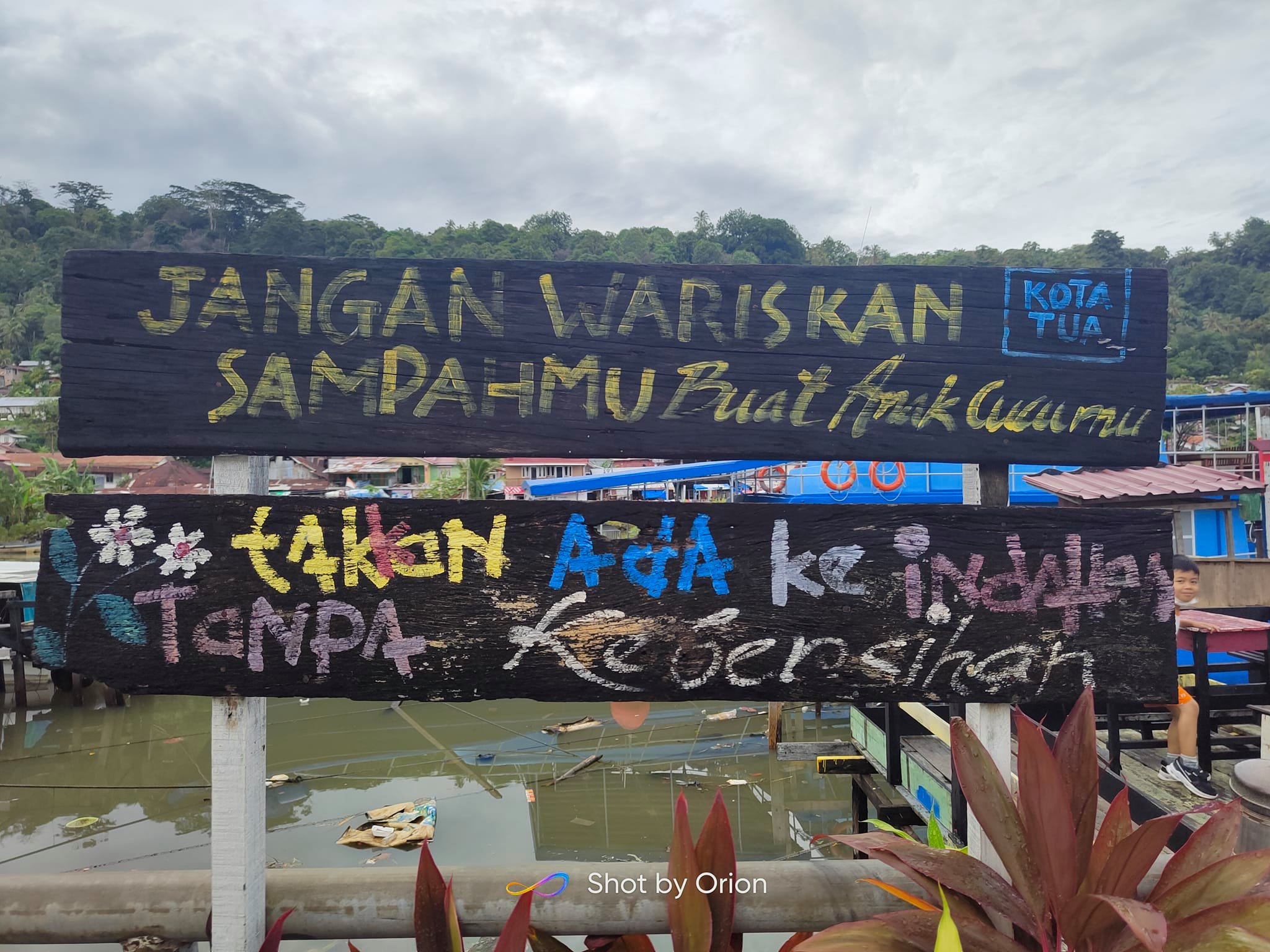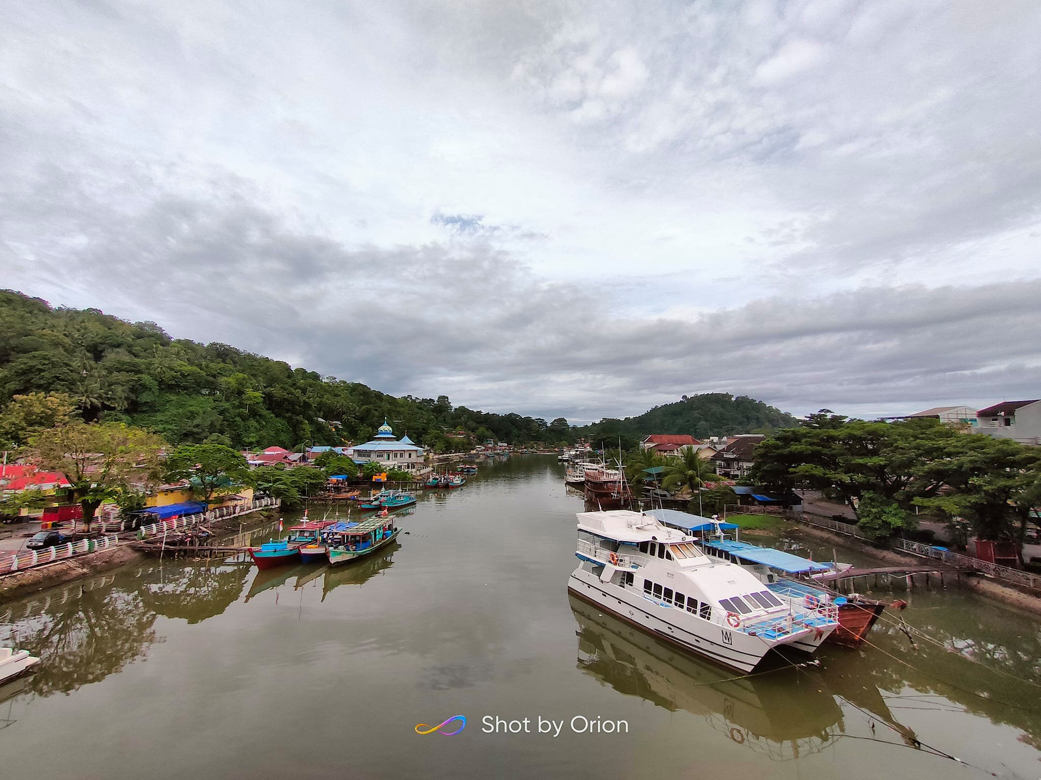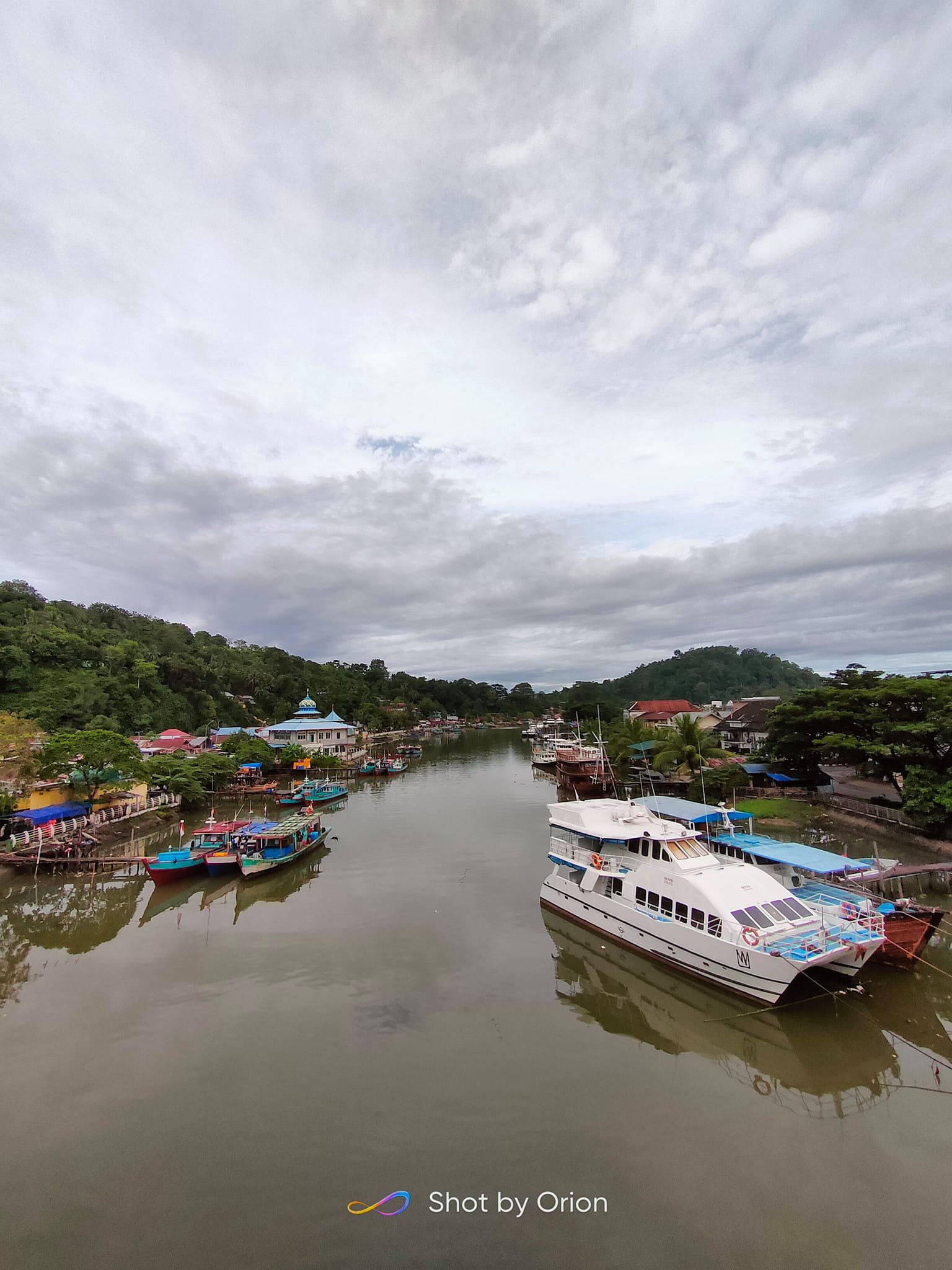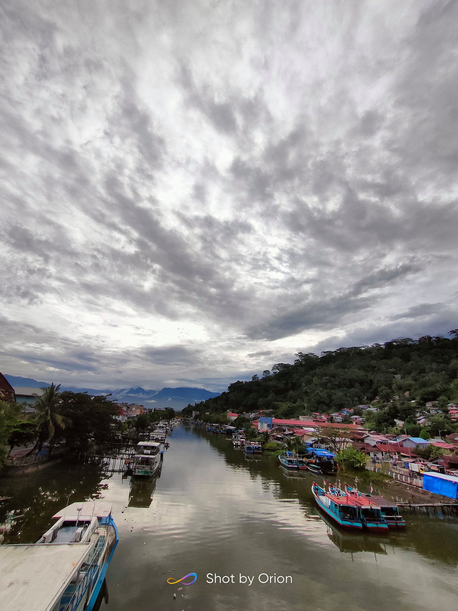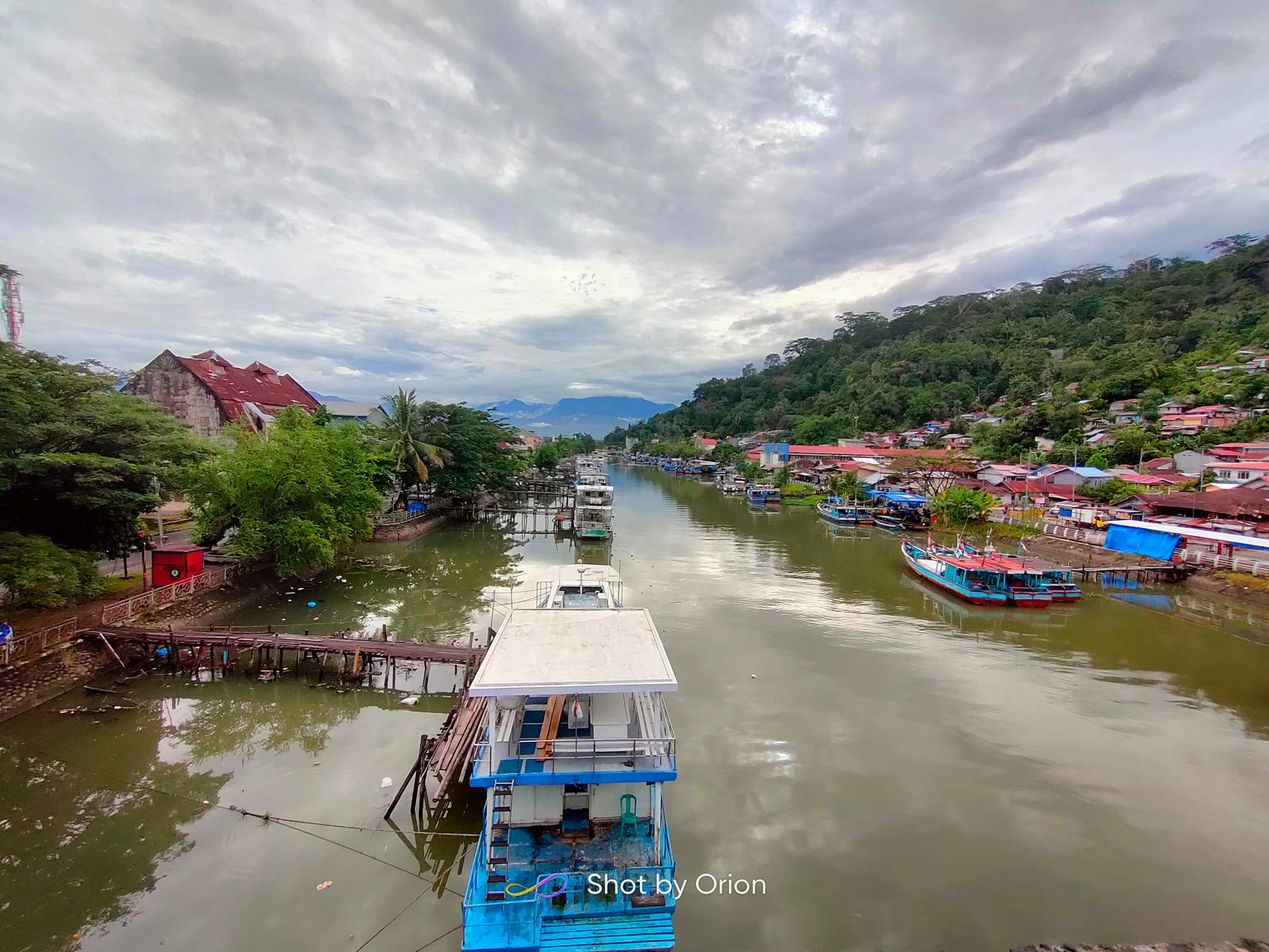 Dari atas jembatan, kita dapat menikmati pemandangan lepas suasana muaro dengan kapal-kapal yang sedang bersandar.
