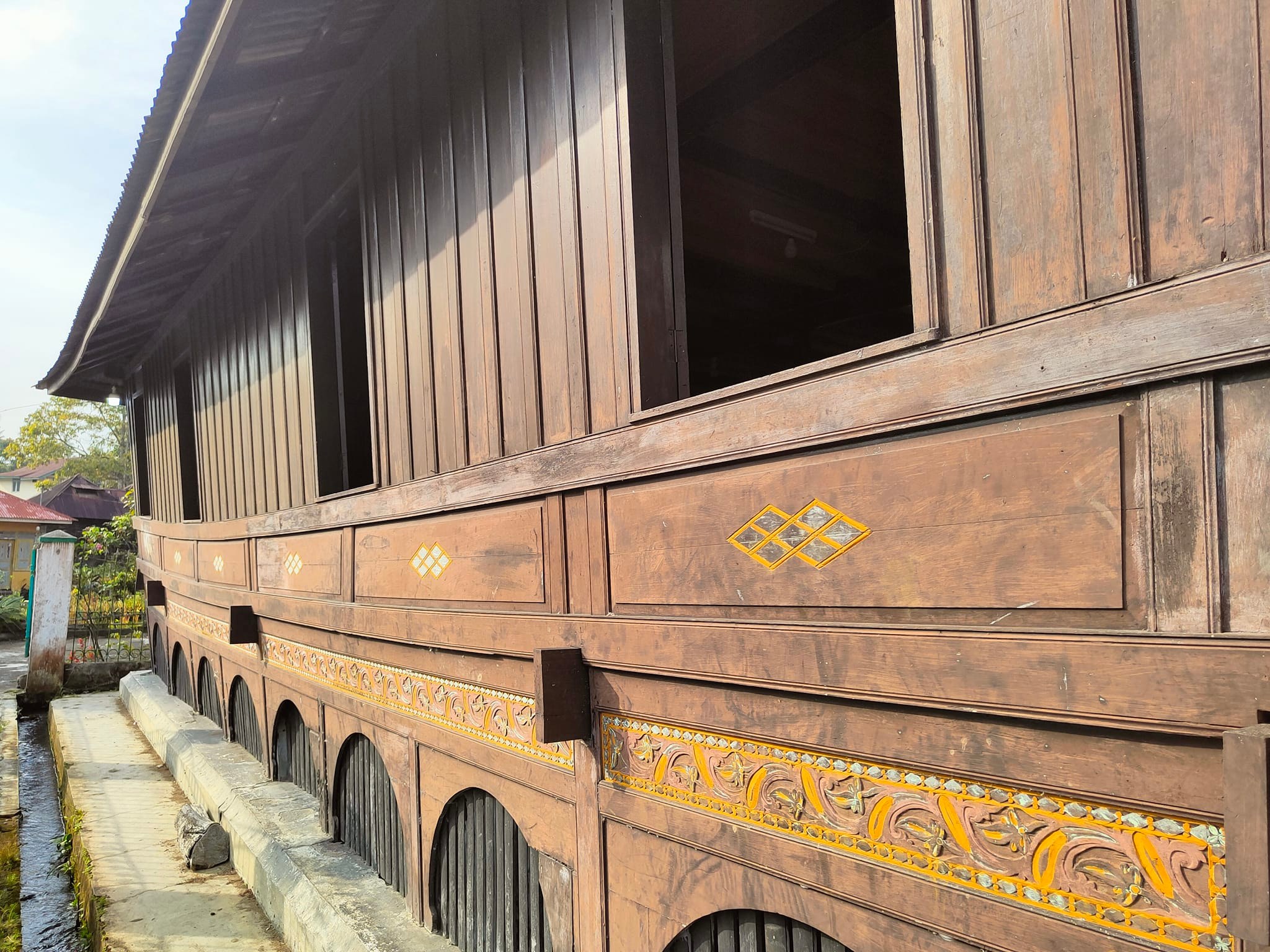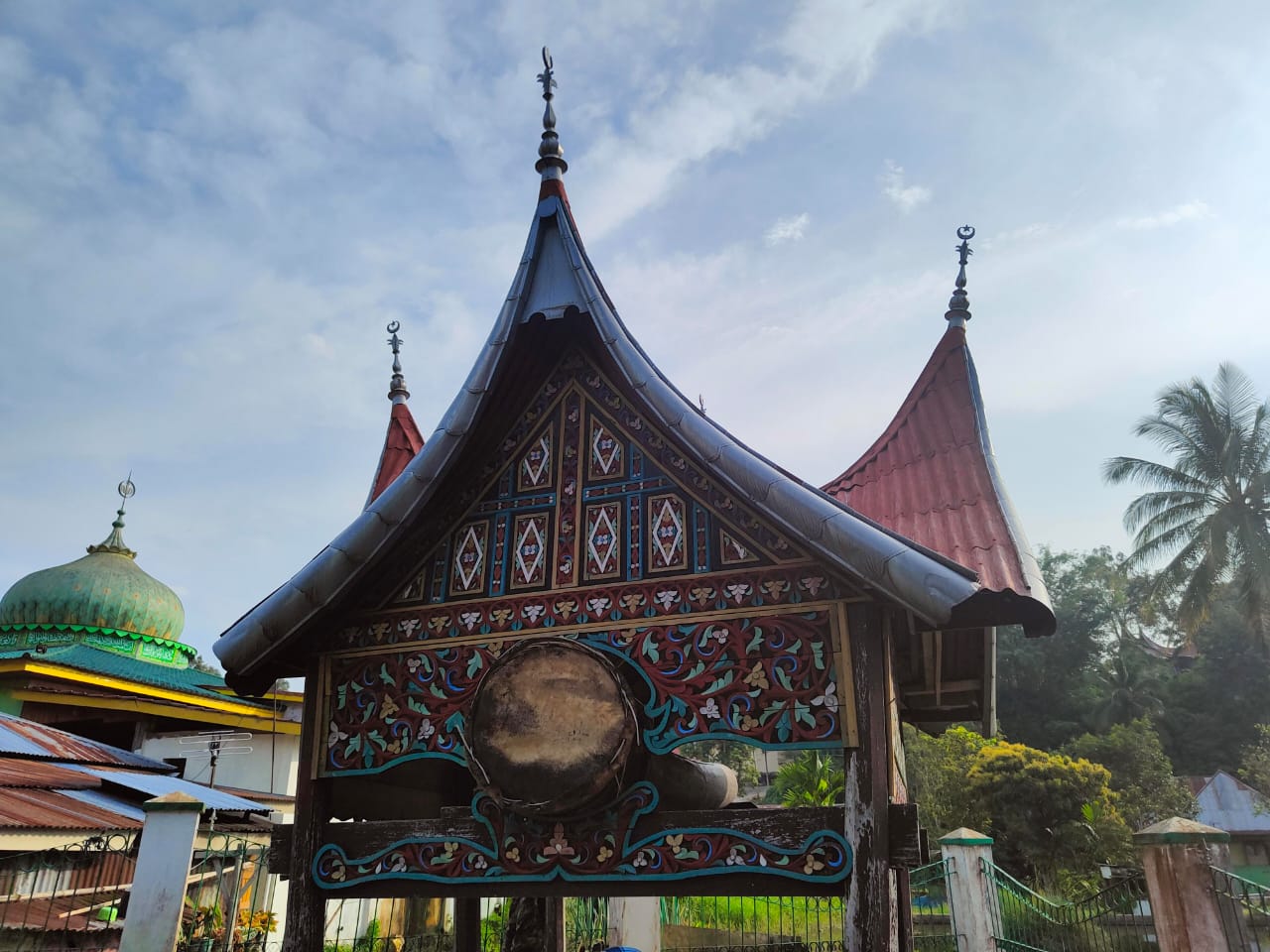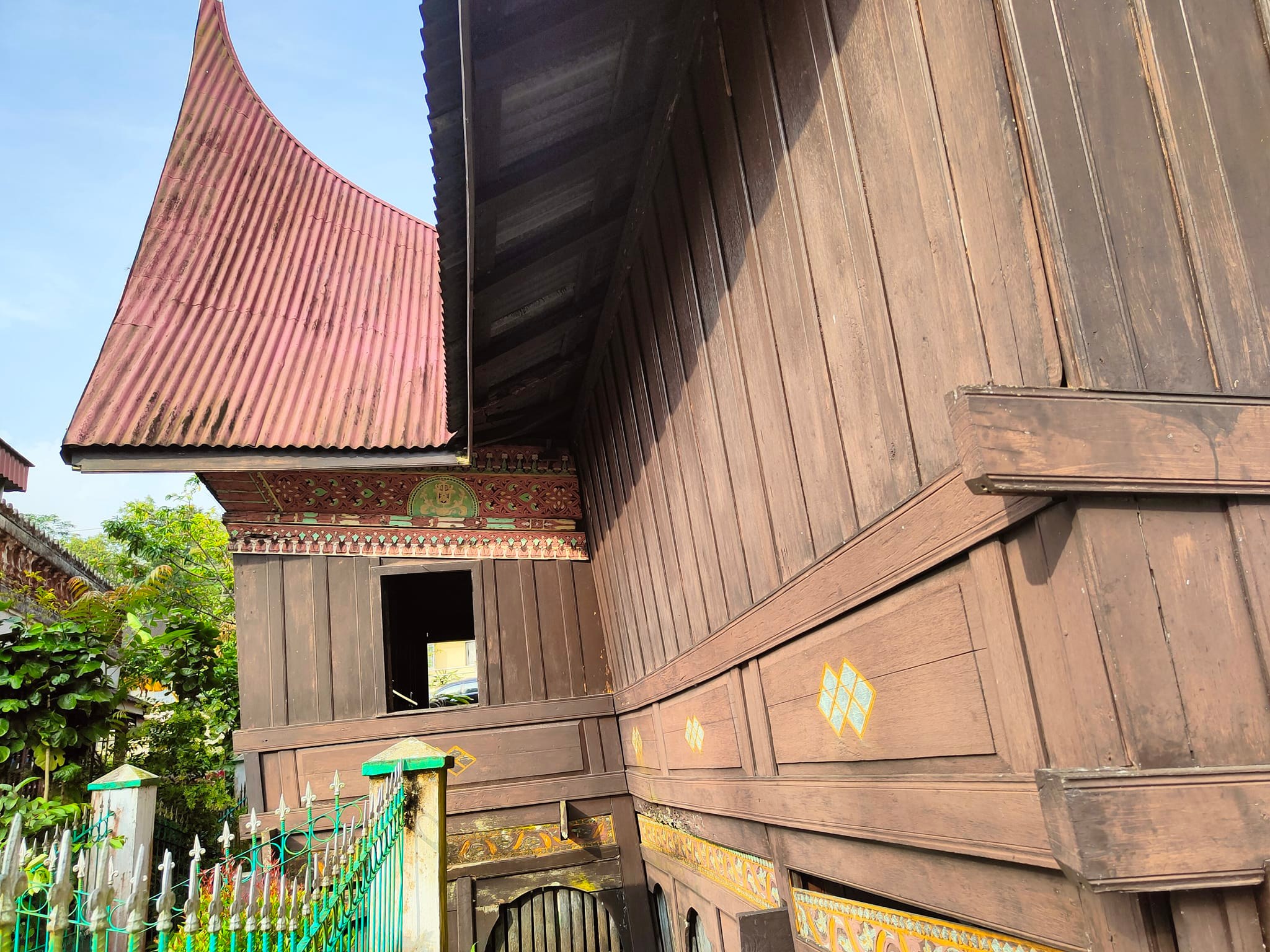 Pada bagian puncak, terdapat elemen berupa semacam gardu, berdenah segi delapan berdinding kayu dengan jendela-jendela semu yang diberi kaca di setiap sisinya. Struktur ini berfungsi sebagai minaret, yang dapat dinaiki melalui tangga spiral di lantai dua. Atap mineret dibuat bersusun membentuk kerucut dengan bentuk susunan buah labu dihiasi kelopak daun mirip padmanaba pada bangunan Hindu. Eksterior berupa ukiran Minang melekat pada dinding minaret berupa pola tumbuhan pakis yang didominasi warna merah, kuning, dan hijau.